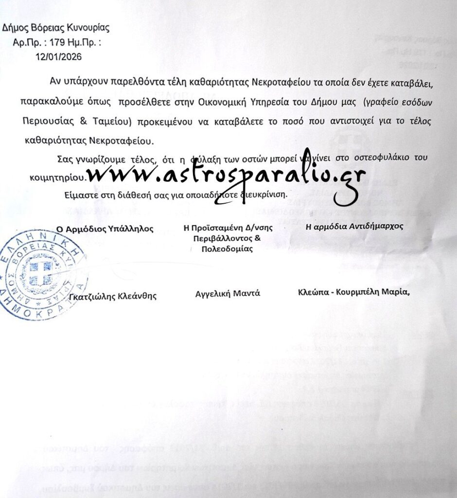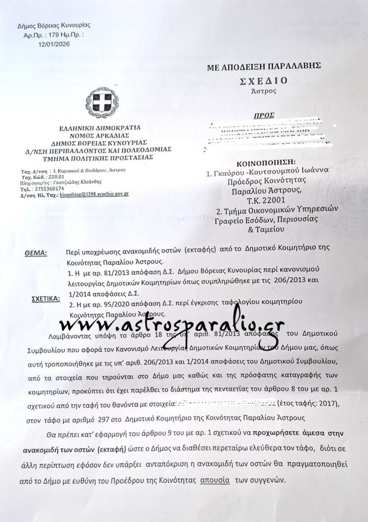 Έντονες αντιδράσεις και προβληματισμό προκαλεί επιστολή που απέστειλε ο Δήμος Βόρειας Κυνουρίας σε συγγενείς αποβιωσάντων, οι οποίοι είναι θαμμένοι στο Κοιμητήριο Παραλίου Άστρους.