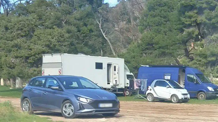 Τα οχήματα βρίσκονται κάτω από τα δέντρα και δίπλα στους φοίνικες, ενώ οι επισκέπτες επιλέγουν συνειδητά την ελεύθερη κατασκήνωση, αγνοώντας τα νόμιμα οργανωμένα κάμπινγκ της ευρύτερης περιοχής, τα οποία λειτουργούν με προδιαγραφές ασφαλείας και υγιεινής.